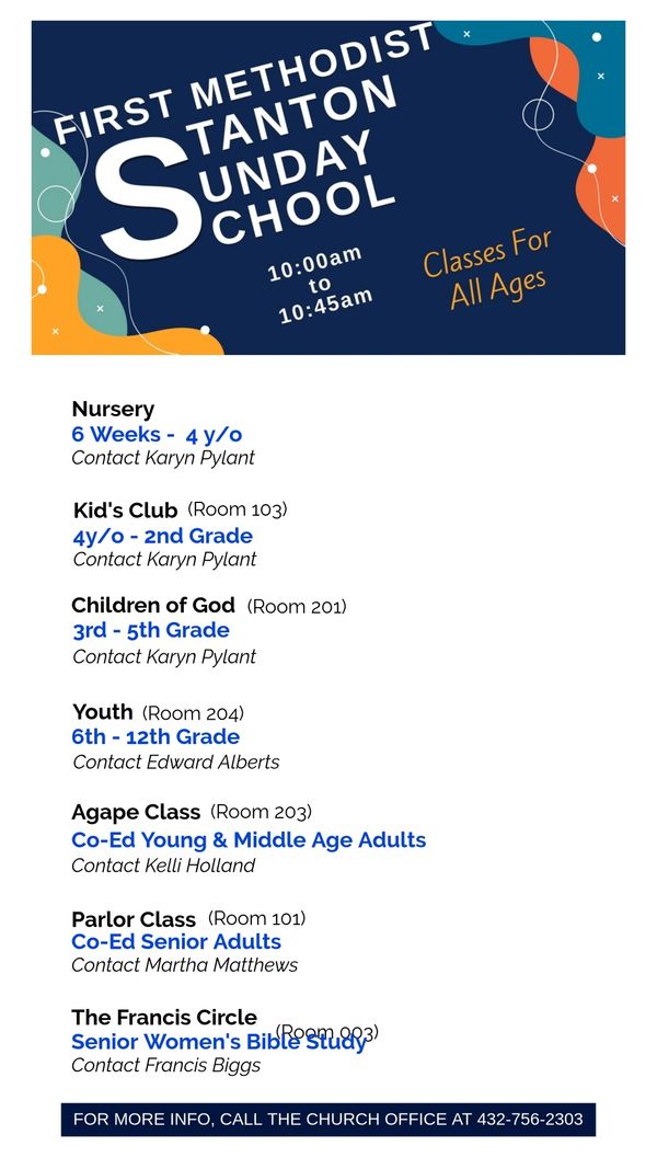 Dinner begins at 5:45pm in the Fellowship Hall. Ministries begin after dinner followed by a short worship service in the Sanctuary! Dinner will be provided by Kim & Lester Baker or catered from Midland!